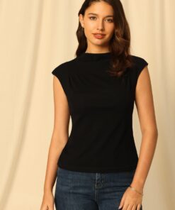 Women’s Mock Neck Blouse Basic Cap Sleeve Knitted Tops