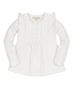 - Crafted from a soft and stretchy organic cotton jersey blend, this top features flutter details at the shoulders, pintucking at the yoke, and a button front placket.